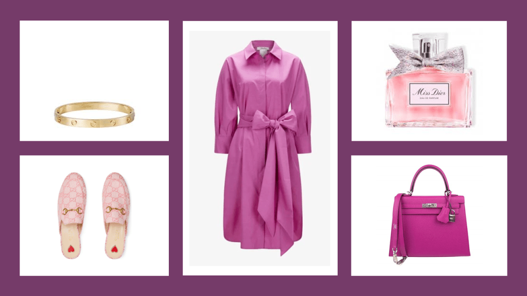 Kleid: Max Mara Weekend, Schuhe: Gucci Princetown Slipper, Parfüm: Miss Dior, Armband: Cartier Love Armreif, Tasche: Hermès Mini Kelly Pink Bag